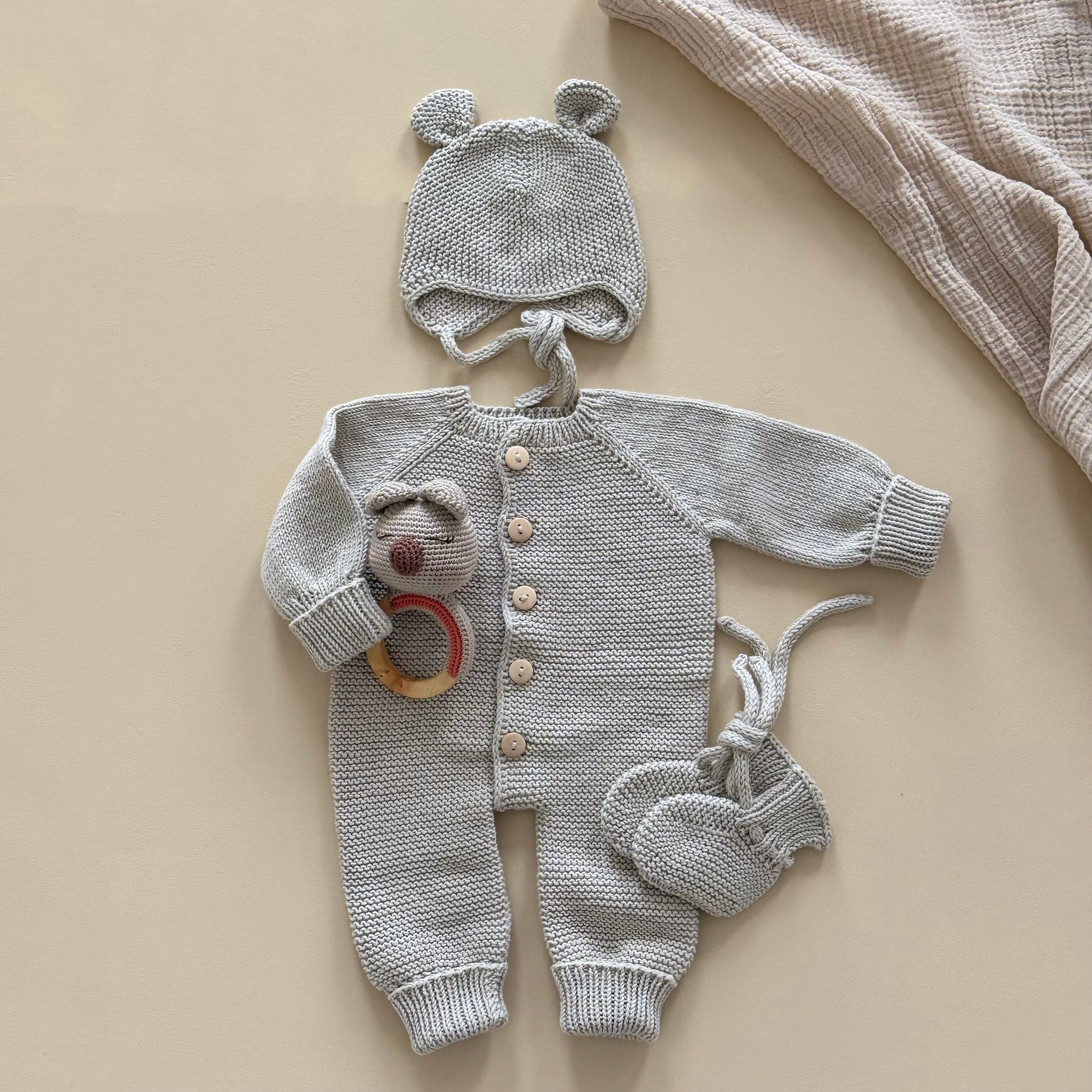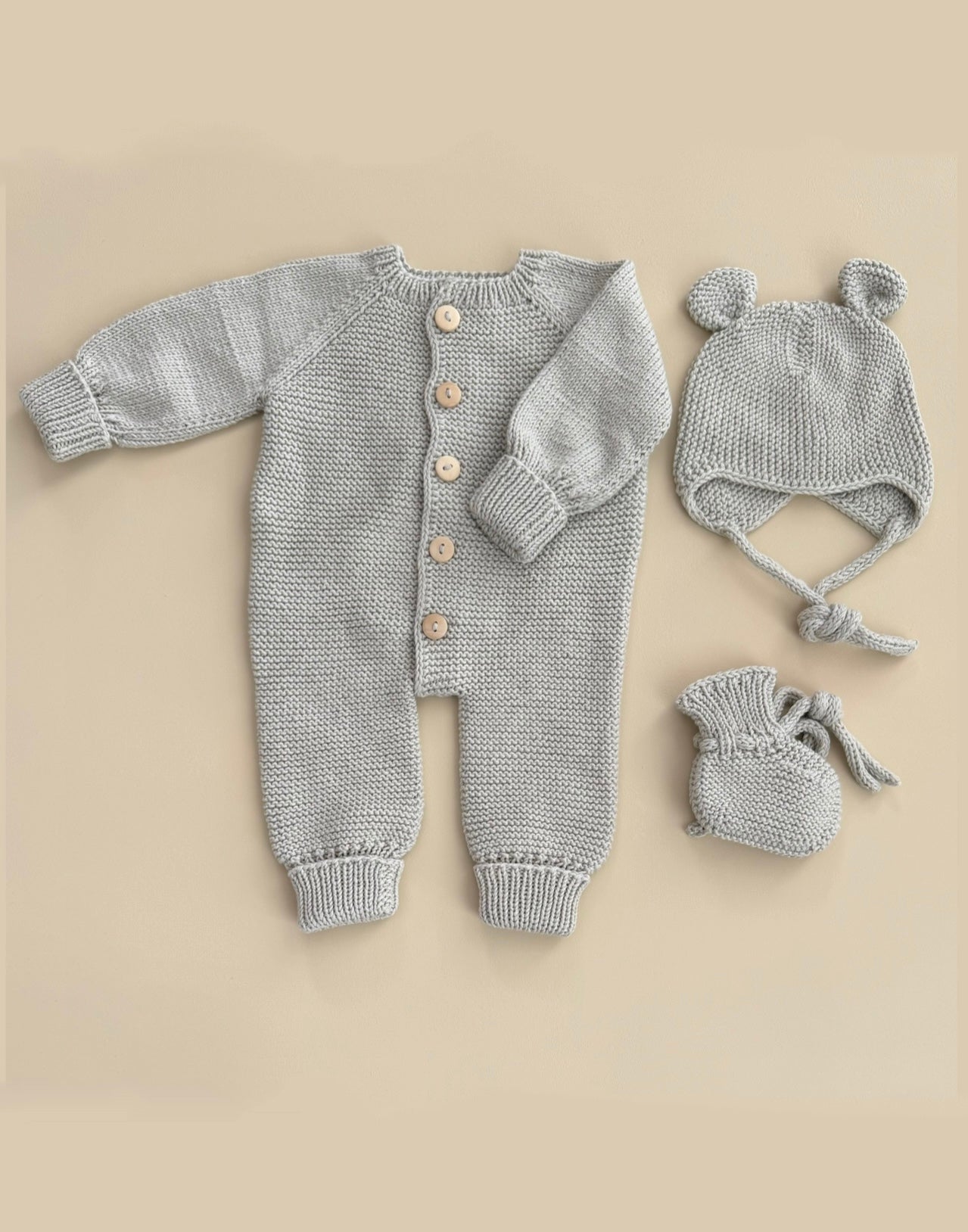 Een bewuste keuze voor de allerkleinsten: dit handgebreide newborn setje van 100% biologisch katoen combineert zachtheid, stijl en duurzaamheid. Dit setje bestaat uit een boxpakje, mutsje en slofjes. Alles wat je nodig hebt voor een warme en comfortabele start.