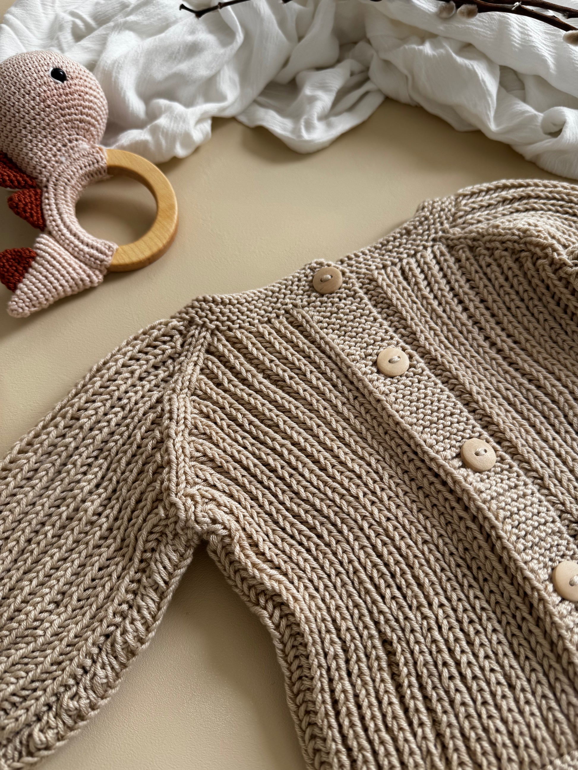 Een tijdloos kledingstuk voor de allerkleinsten: dit handgebreide babyvest is gemaakt van 100% biologisch katoen en afgewerkt met mooie houten knopen. De natuurlijke materialen maken dit vestje niet alleen stijlvol, maar ook zacht, ademend en vriendelijk voor de gevoelige babyhuid.