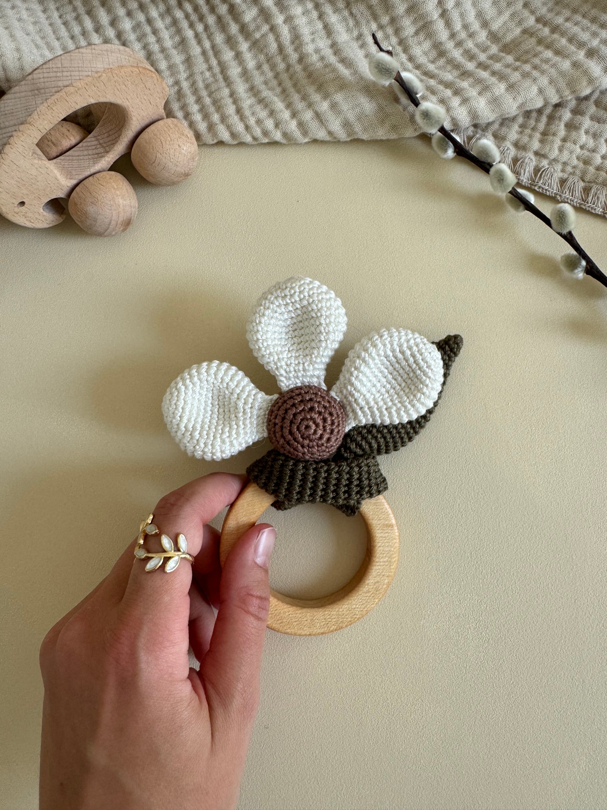 Ontdek onze biologisch handgebreide rammelaar met bijtring, het perfecte duurzame babycadeau voor elke bewuste ouder. Deze prachtige rammelaar wordt met de hand gebreid van 100% biologisch katoen (GOTS-gecertificeerd) en is volledig vrij van schadelijke stoffen.