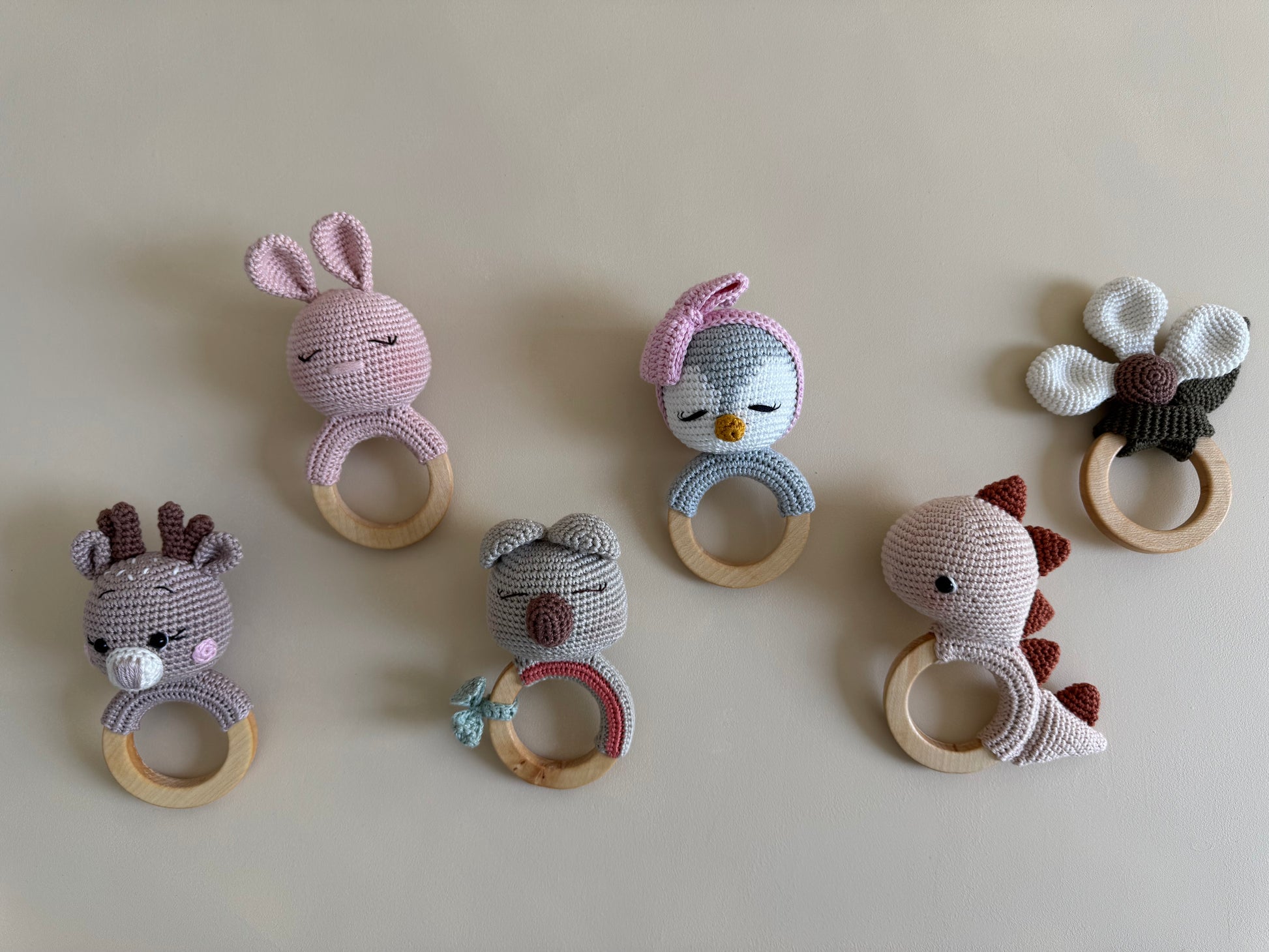 De houten bijtring is gemaakt van onbehandeld, natuurlijk beukenhout. Het is veilig om op te bijten en perfect voor het verzachten van doorkomende tandjes. Dankzij het zachte rammelgeluid stimuleert deze rammelaar op een rustgevende manier de zintuigen van je baby. Bovendien is de rammelaar verkrijgbaar in verschillende kleuren en figuurtjes, zodat er altijd een variant is die perfect past bij jouw stijl of als uniek kraamcadeau.