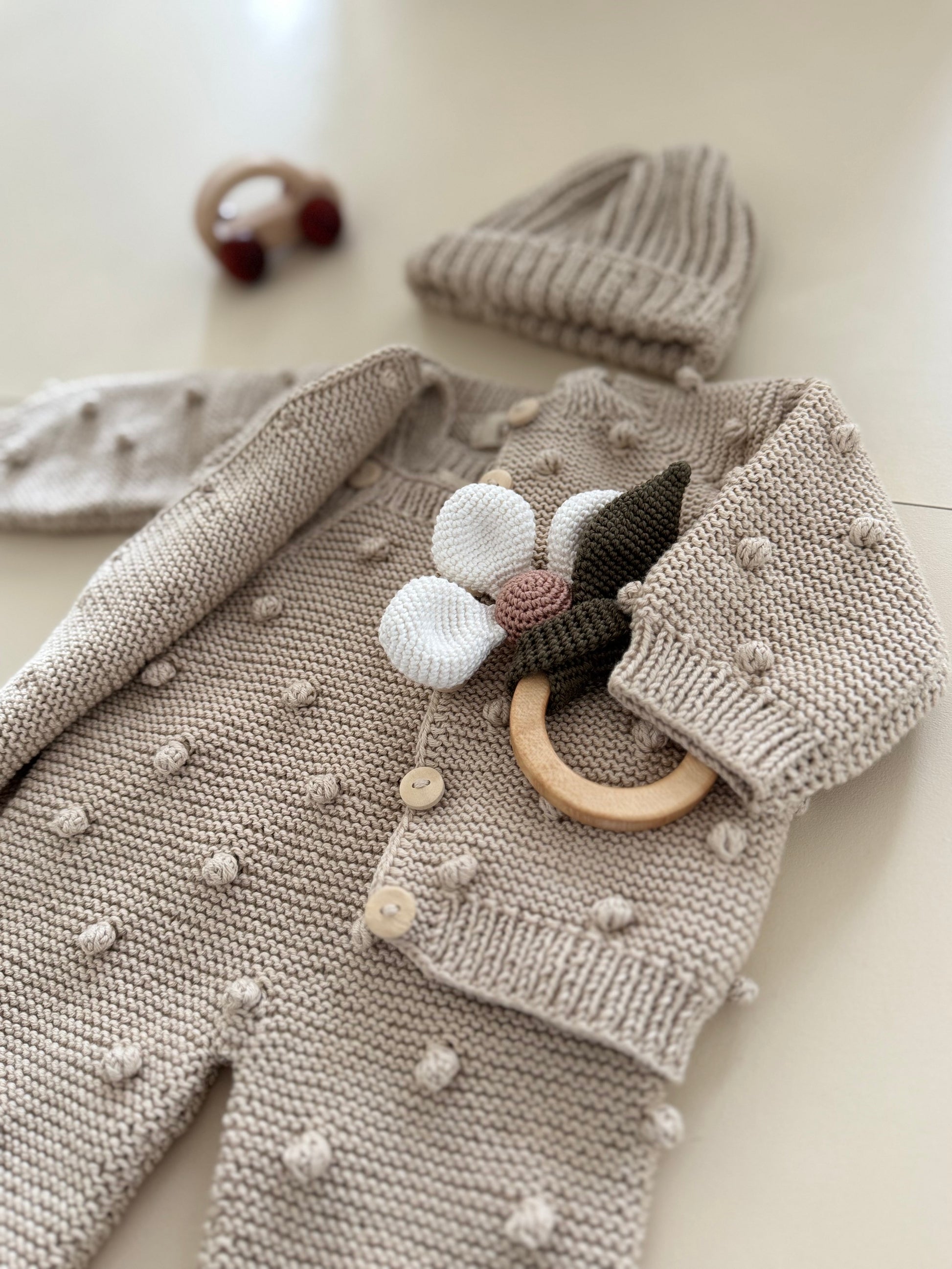 Een uniek handgemaakt vestje, vervaardigd van puur biologisch katoen en afgewerkt met schattige pompons voor een speelse touch. Het vest combineert moeiteloos stijl, comfort en duurzaamheid. Is ideaal voor elk seizoen.